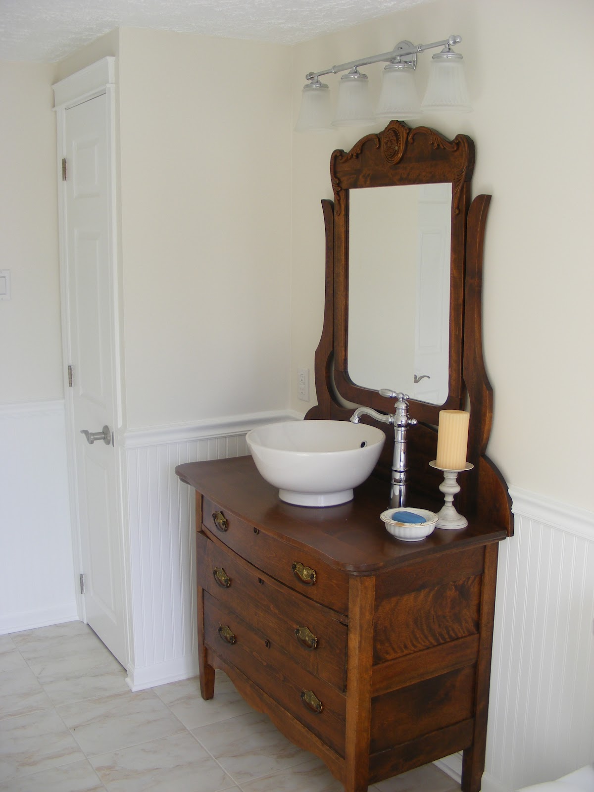 I have a lovely antique wash stand that I would like to turn into a vanity for my guest bathroom.  What do I need to do to make this work?  I have a friend who did it with an old dresser and I just love it so I went to the flea market and bought an old piece, cause I want one too.  Please help me because I don’t want to screw it up.